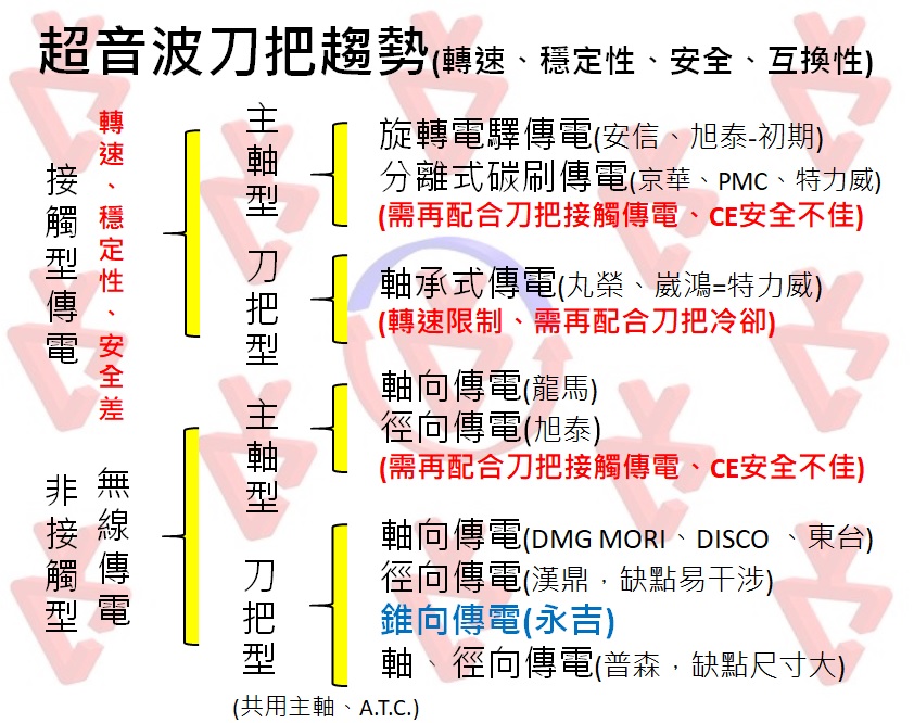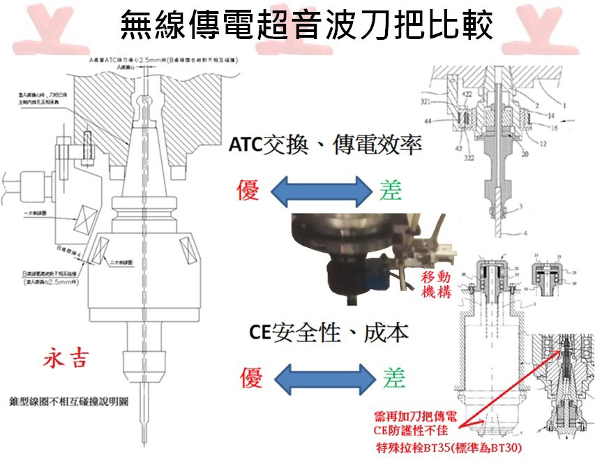 永吉超音波刀把:轉速高(非接觸型傳電)、穩定性佳(非接觸型傳電與振動子中心冷卻-提昇壽命與溫昇穩定)、效果佳(可提供最佳化加工參數、客製刀把、刀具設計與分析服務)、永吉獨創安全防呆設計、主軸上安裝容易(可安裝任何主軸上)、售價合理。